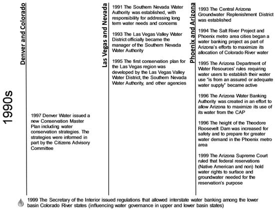 A growing number of disciplinary and interdisciplinary scholars have concluded that transitions towards comprehensive sustainable natural resource management are necessary as human-environment systems face grand challenges such as global climate change and political and economic instability [1]. Transitions have been defined in the sustainability literature as a gradual process of societal change leading to structural differences in major social-ecological-technical systems such as water, energy, or agriculture [1,2]. Water governance is one area of natural resource management that has been the focus of attention for sustainability transitions. The history of water management in the western United States has been marked by episodes of significant conflict, but also innovative collaboration [3]. As the population in the western U.S. steadily increased over the past century, conflicts over water allocation emerged, especially in places with large population centers and competing interests between domestic, agricultural and industrial uses. This has led to calls for water governance transitions in the Colorado River Basin [4]. Identifying patterns and understanding the context of historical transitions within a system can inform future efforts to intentionally transition a system towards sustainability. In this research, we contribute a comparative historical analysis of water governance transitions in three cities reliant on Colorado River water. We additionally examine events at the state level that influence the three cities. Our goal is to interpret the historical context to identify patterns. Such an understanding may provide insights related to (1) catalysts and unintended consequences of past events and (2) practical considerations (such as timing and stakeholders involved) [5]. This information may be relevant to scientists, managers, and policy makers who develop strategies for transitioning sites towards more sustainable, water sensitive areas.