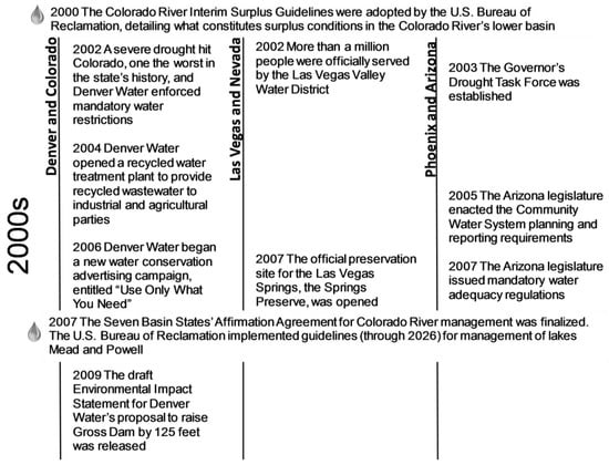 In this decade, sustainability discourse became more widespread as major residential water providers in Arizona, Colorado, and Nevada attempted to respond to environmentalists’ concerns about the sustainability of water consumption and supplies (Figure 14). Responses were also addressing scientists’ projections that water supplies in the Colorado River may continue to dwindle in drought conditions and shortages may be declared [60]. Residential water suppliers in all three cities and states made efforts to produce sustainability-related assessments and materials, including conservation, sustainability, and energy efficiency reports. Related efforts are ongoing in all three cases, but the focus on sustainability in terms of environment, economy, and society from environmental groups and other stakeholders is a gradual recognition of the principles of “water sensitive cities.” It has been argued that these emerging efforts are not enough to incite a transformation in water demand and usage, especially in the agricultural and industrial sectors, that may be necessary if (perhaps more accurately, when) drought conditions are declared in the Colorado River Basin [65,66].