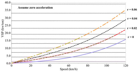Note that a measure to quantify vehicle emissions has also been suggested. Vehicle-specific power (VSP) is defined as the instantaneous power per unit mass of the vehicle, which is subject to vehicle speed, acceleration, and road grade to estimate engine power demand while accounting for rolling resistance and aerodynamic drag. Assuming zero acceleration to simplify the sensitivity analysis, road grade was varied from 0 to 6%. Figure 1 shows the sensitivity of VSP and emissions to road grade and speed [].