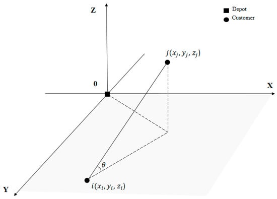 The GVRP can be represented as a three-dimensional graph, where the vertices are in the three-dimensional space, i.e., for vertex i, and the arcs connect pairs of vertices. In this paper, represents a complete and symmetric graph, where denotes vertices 1, 2, …, n for n customers and 0 for the depot, and is the arc set whose elements connect all pairs of vertices. Figure 2 exemplifies a three-dimensional space with a depot at the origin and two customers i and j.