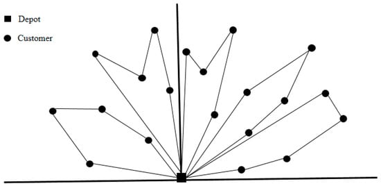 Gillett and Miller (1974) [] introduced the sweep algorithm, which is one of the most well-known two-phase constructive methods to solve medium-scale and larger-scale capacitated vehicle routing problems (CVRPs) with load and distance constraints for each vehicle. It decomposes the CVRP by clustering geographically close customers into groups, such that each group is serviced by a single vehicle. To cluster customers in this paper, an identical number of customers is assigned into each group, considering the numbers of customers and available vehicles, instead of the customer demands and the vehicle capacity. A route is then created by connecting neighbors in angular proximity. When determining angular locations of customers, only x and y coordinates are considered. An example of the initial solution by the sweep algorithm is illustrated in Figure 3.