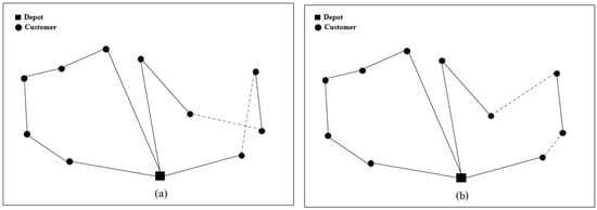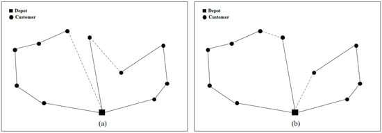 A hierarchical 2-opt algorithm has been proposed: inter-2-opt and intra-2-opt algorithms. The inter-2-opt algorithm between two routes removes an edge from each route and reconnects the remaining routes using two new edges as long as ZLR is improved. Figure 4 shows two sets of possible routes. Assuming that ZLR in Figure 4a is greater than ZLR in Figure 4b, the dotted edges in Figure 4a are removed, and the dotted edges in Figure 4b are added to improve the routes.
