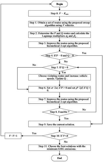 Given a set of routes to satisfy all customers’ demands, where there are P and Q routes violating the vehicle capacity and operating time constraints, respectively, we want to index the corresponding routes as p = 1, 2, …, P and q = 1, 2, …, Q in the order of violation amounts. Lagrangian multipliers and are considered as penalties (per unit weight or per unit time violated) to routes p or q, which violate the vehicle capacity and operating time constraints, respectively. That is, and . By these constraints, the larger penalty is applied to the route with a more serious violation in terms of vehicle capacity or operating time constraints. If we are interested only in finding feasible solutions quickly, and can be set to large numbers; however, these solutions might be far from the optimal solution. Because our purpose must be to find the feasible solutions closer to the optimal solution, we need to approach the feasible solutions by increasing and gradually from small values.