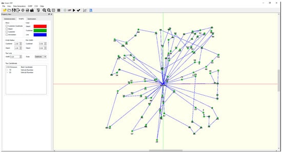 A complete solution method has been developed in the Visual C++ language with the QT library and implemented on a PC with an Intel Core i7-4792 CPU at 3.6 GHz and 16 GB of memory. The computation times in this section are recorded in seconds. The developed program demonstrates an example route visually as shown in Figure 7.