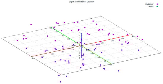 Experiments using various test problems have been run to assess the effectiveness and efficiency of the proposed solution method. The problem instances used in these experiments have been generated randomly as follows. The customers’ locations are generated three-dimensionally using uniform distributions with given ranges per axis, and the depot is always located at the origin (0, 0, 0). Figure 8 shows an example of a three-dimensional map for randomly generated customer locations using ranges [−50, 50] for the x- and y-axes and [−5, 5] for the z-axis. The customer demands are randomly generated by specifying the maximum demand per customer.