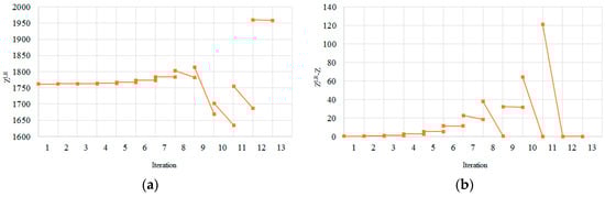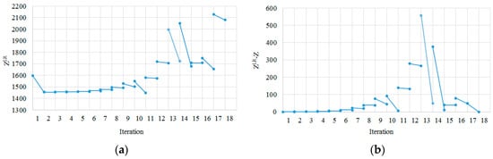 Figure 9 shows the Lagrangian-relaxed objective function values, ZLR, and the penalties, Z − ZLR, in each iteration when 5 vehicles are used. Figure 10 shows the same when 6 vehicles are used. In these figures, there is a line segment in each iteration, which shows the amount of changes in corresponding values during each iteration of the proposed solution method. On each vertical grid line, there are two values that represent the value at the end of the previous iteration and the other at the beginning of the next iteration. This is because the proposed solution method updates the violating constraints and Lagrangian multipliers and in every iteration, and then the values of ZLR or Z − ZLR are re-evaluated. Since Lagrangian multipliers and monotonically increase, the corresponding values at the beginning of the next iteration are always greater than the other. Note that some values are close and overlap in the figures.