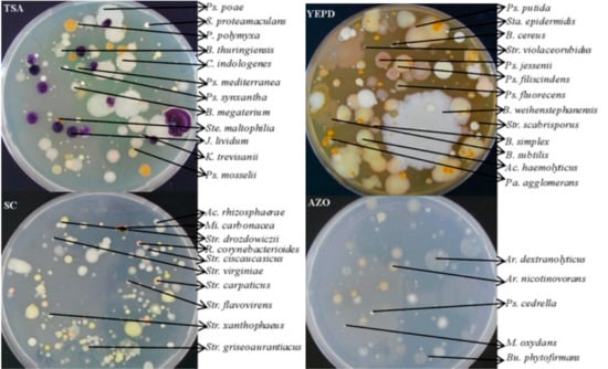 Different morphological typologies and corresponding species of bacterial colonies rose in TSA, SC, YEPD, and AZO media seeded with the soil sample of fall of the third year. Ps, Pseudomonas. S, Serratia. P, Paenibacillus. B, Bacillus. C, Chryseobacterium. Ste, Stenotrophomonas. J, Janthinobacterium. K, Klebsiella. Mi, Micromonospora. R, Rhodococcus. Sta, Staphylococcus Ac, Acinetobacter. Pa, Pantoea. M, Microbacterium. Ar, Arthrobacter. Str, Streptomyces. Bu, Burkholderia. Modified from Muñoz et al., 2010 [56].