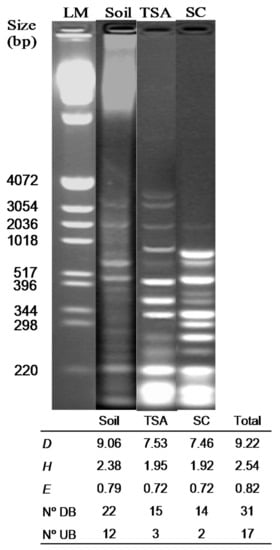 PCR-agarose of bacterial DNA from the soil sample of fall of the third year. LM, 1 kb DNA ladder. Soil, DNA from soil. TSA and SC, DNA from cultured bacteria raised in TSA and SD media respectively. D, Simpson dominance index. H, Shannon general diversity index. E, evenness index. Nº DB, number of different bands. Nº UB, number of unique bands.