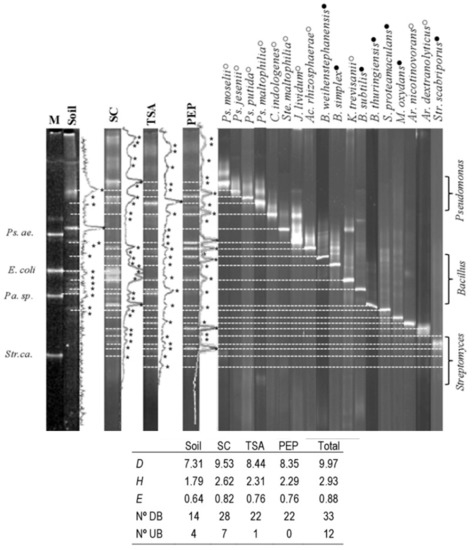 PCR-DGGE and density traces of bacterial DNA from the soil sample of fall of the third year. M, migration markers (Ps. ae., Pseudomonas aeruginosa; E. coli, Escherichia coli; Pa. sp., Paenibacillus sp.; Str. ca., Streptomyces caviscabies). Soil, DNA from soil. SC, TSA and PEP, DNA from cultured bacteria raised in SC, TSA and PEP media respectively. ○, Gram−. ●, Gram+. Streptomyces, migration zone of the PCR fragments of Streptomyces; Bacillus, zone of Bacillus; and Pseudomonas, zone of Pseudomonas. *, density peaks detected by Quantity software. D, Simpson dominance index. H, Shannon general diversity index. E, evenness index. Nº DB, number of different bands. Nº UB, number of unique bands. Ps, Pseudomonas. C, Chryseobacterium. Ste, Stenotrophomonas. J, Janthinobacterium. Ac, Acinetobacter. B, Bacillus. K, Klebsiella. S, Serratia. M, Microbacterium. Ar, Arthrobacter. Str, Streptomyces. Modified from Muñoz et al., 2010 [56].