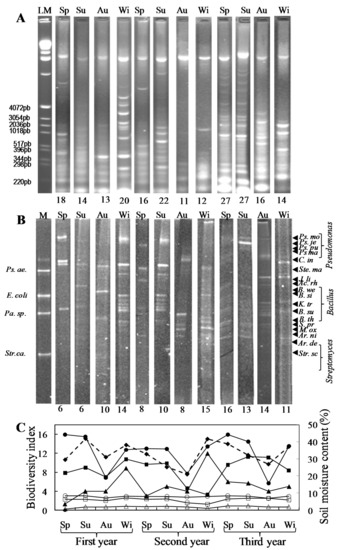 The seasonal fluctuations of most bacterial genera, the total number of bacteria, molds, and total microorganisms were greater than the interannual fluctuations (Table 1). Coinciding with the decrease in soil moisture content, the amounts of cultured bacteria, molds, and total microorganisms were usually lowest in the fall; whereas the high summer temperature seems to increase the relative abundance of the Gram+ spore-forming bacteria Streptomyces and Bacillus. Similar results have been reported for a pasture soil, where microbial biomass was highest from April to August, and decreased during the fall to winter period [67]. Shi et al. [68] also found low values for most microbial properties in a maize-soybean rotation under dry weather conditions. Also, the proportion of most of the species detected among the cultured bacteria mostly varied with the same general trend. The exceptions of Acinetobacter and Stenotrophomonas which increased in the fall could be due to the increased oxygenation of the soil concomitant with the reduction in moisture content, or to the disappearance of rhizodepositions after harvest [69,70]. Such changes in environmental conditions could result in a relative increase in growth of Acinetobacter and Stenotrophomonas with respect to the rest of the bacteria, and so induce some suits in the bacterial communities, showing a dynamic bacterial succession in the studied soils. The other exception to the general pattern found in the analysis of the bacterial communities occurred during the second sampling year, when lower index values were observed in summer than in fall. According to Shi et al. [68], this could have been due to the warm weather conditions with high summer temperature reached that year (mean of 32.73 °C during the second-year vs. 30.27 °C and 31.55 °C for the first and third years, respectively) [68]. D and H indices also decreased in fall, coinciding with the decrease in soil moisture content (Table 1 and Figure 4C). While a similar number of bacterial species were detected throughout the year using culturing methods, culture-independent methods (PCR-DGGE) showed seasonal variations, indicating changes in the dominant members of the bacterial communities in the studied soils. The evenness of the cultured microorganisms, however, remained roughly constant throughout the three years, as also did the evenness estimated by soil PCR-agarose and PCR-DGGE (data not shown).