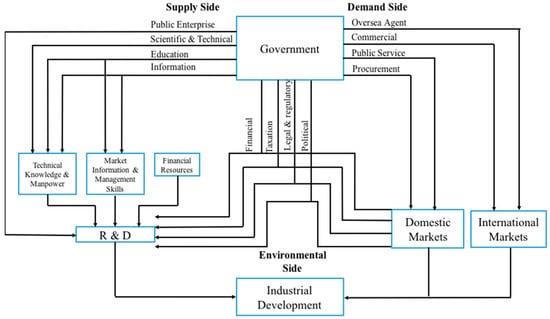 Innovation policy includes science and technology (S&T) policy and industry policy. The making of industry policy is based upon demand-side consideration. Rothwell and Zegveld’s [] research summarized three dimensions with 12 innovation policy tools, which provide a concrete analysis tool for government support technology and innovation development on the national level. The policy framework examined in the study by Rothwell and Zegveld [,] summarized a categorization of innovation policies, including supply (public enterprise, scientific and technical, education, and information), demand (procurement, public service, commercial, and overseas agents), and environmental (political, legal and regulatory, taxation, and financial) policy tools [].
