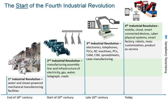 The scope of the fourth industrial revolution includes electric and clean-tech vehicles, renewable energy, the smartgrid, IoT/IoE, Big Data, robotics, AI, fintech, blockchain, VR, cybersecurity, and agtech/agricultural innovation. These technologies are often deemed unrelated, but when they are joined together, they integrate the physical and virtual worlds. This change enables a powerful new way of organizing global operations: introducing the fungibility and speed of software to large-scale machine production. Cyber-physical systems, and the skills disruption that these systems bring about, are also associated with the fourth industrial revolution. IoT and CPS are what at stake in the fourth industrial revolution. The smart factory or smart something must build on the fitting of data processing, communication, and interaction between machines []. The Figure 2 below shows the product systems evolution from the first industrial revolution to the fourth [].