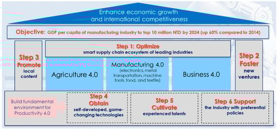 There are six steps in building the Taiwan Productivity 4.0 plan. First, optimizing the smart supply chain ecosystem, especially in critical leading industries. Second, fostering new ventures; the movement of new ventures and startups is strong and prosperous in Taiwan. However, incubating and accelerating the new ventures in CPS-related areas, solution services, materials, medical, and smart manufacturing could facilitate sustainable competence-building. Third, promoting those local contents with competitiveness—such as critical components, systems, or services—will help enhance their capabilities of Productivity 4.0. The forth step will be obtaining self-development and game-changing technology capabilities. Cultivating experiences and talents through industrial–academic-institute cooperation, interdisciplinary learning, and international linking to build up their own competitiveness will be the fifth step. The last step is to support industry development and lead enterprise proliferation by the necessary industry policy tools to complete the whole ecosystem.