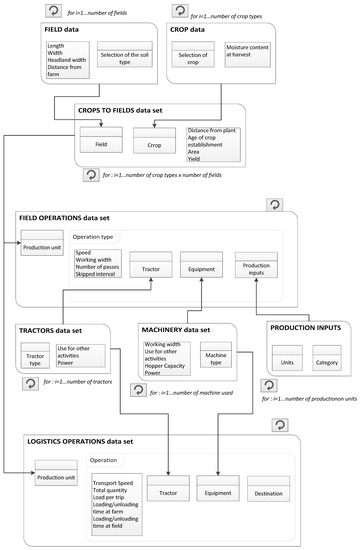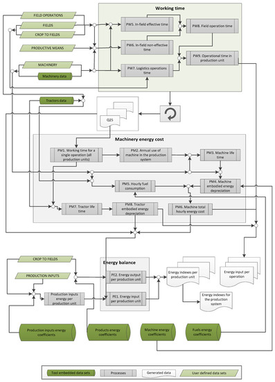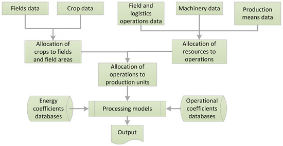 The general structure of the tool is presented in Figure 1. The user provides a series of input data regarding the fields, crops, machines, in-field and logistics operations, and productions means. Based on these data, various entities such as crop groups, field groups, and production units (a field or a field area with a specific crop) are generated by the tool. Then, a series of processing models are applied using also several embedded databases, such as the energy coefficients for all means used for the crop production, operational coefficients for the estimation of the various task times and power requirements for all machinery involved in field and logistics operations.
