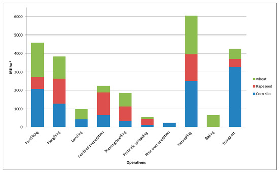 The energy requirements in logistics operations are influenced by the transport distance, the implemented machinery system, and the amount of the product to be transported from the field to the facilities. The amount of the product is a function of the crop type and the yield. This is the main reason why logistics operation in corn silo (LO1) requires the highest energy among the crops of the production system (2.964 MJ ha−1). For the case of the wheat, there are two logistics operations, one for the grain (LO3) and one for the straw (LO4) transportation. The energy requirements for both operations are low because fields are located nearby the facilities and the yield of wheat is below 5 t ha−1 for both products.