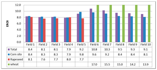 The EROI index is presented on detail in Figure 5 for each individual production unit (field and crop). As mentioned earlier, the crop with the higher performance in terms of EROI is the wheat due to the exploitation of the two types of biomass that produces and due to the fact that wheat is not irrigated. The stepping decrease of the EROI index for the wheat from field F6 to F10 shows the effect on the EROI of the increasing distance between the field and the facilities. In Figure 5, the slightly better performance in terms of EROI of the corn silo compared to the rapeseed can also be detected.