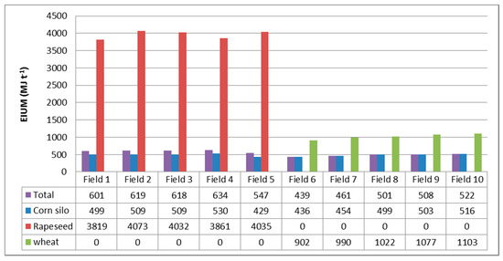 Figure 6 presents the EIUM index for each of the crops in the production system in all individual fields. Rapeseed provides the highest EIUM compared to the other crops and this is mainly because the final biomass product that provides energy is oil seeds with a low yield compared to the other crops. However, the output is comparable to the other crops (Figure 5) due to the high energy content of the seeds. The small differences in EIUM between the various fields for the same crop is a result of the different practices followed, the field area, and the distance that biomass is transported.