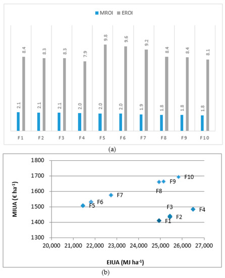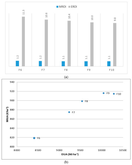Figure 7a presents the values of the EROI and MROI indexes for the case of the corn silo crop for each individual field. The coefficient of variation for the various fields is 7.62% for the EROI (mean: 8.64, STD: 0.66) while for MROI is 6.65% (mean: 1.95, STD: 0.13). The variations of the two indexes are very close. However, for the case of EROI, the different irrigation systems result to a high variation of the energy requirements, since MRS system consumes on average 11,500 MJ ha−1 while the MCI system consumes on average 5500 MJ ha−1. This explains the difference in the energy requirements, for example, between F4 (EROI: 7.9) and F5 (EROI: 9.8), where energy requirements are 26,500 MJ ha−1 and 21,446 MJ ha−1, respectively. On the other hand, the irrigation system applied does not affect the cost and thus the MIUA is almost the same for the two fields (Figure 7b). In terms of the EIUA and MIUA relation, the linear relation for fields F5–F10 and the one for fields F1–F4 is explained by the different irrigation system applied to the two sets of fields.