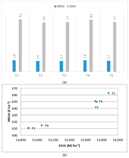The EROI and monetary return on investment (MROI) indexes (a); and the Energy input per unit area (EIUA) and monetary input per unit area (MIUA) (b) for each corn silo fields (F stands for “field”).