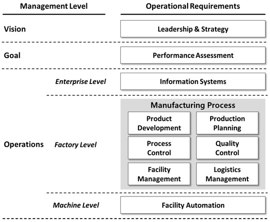 Generally, the level of management activities can be divided into strategic planning, management control, and operational control [17]. In order to make the management activities at the factory smarter, it is necessary to provide operational requirements for each activity. Therefore, smart factory operating system is divided into ‘Vision’ based on high-level strategy, ‘Goal’ based on performance evaluation for management control, and ‘Operations’ at the lower level; with Operations being subdivided according to enterprise-, factory-, and machine levels.