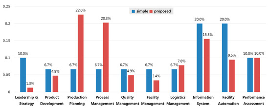 The weightings of each criterion for the proposed methodology is presented in Figure 3 compared to those of the simple methodology. Figure 3 shows that the weightings of Production Planning and Process Management increased significantly because of considering interdependencies in the network model. On the other hand, Leadership & Strategy substantially decreased due to the low importance as a result of the pairwise comparisons related to the criterion. Overall, weights of the proposed method clearly reveal the emphasis placed by the smart factory on Process and System & Automation modules. Improving the core activities’ score of Process and System & Automation modules could be crucial for achieving a higher maturity level of smart factory.