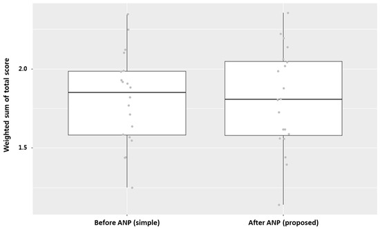 In terms of weighted sum of score, the comparison of simple (BeforeANP) and proposed (AfterANP) methodologies is summarized in Figure 4. The scatter and box plot shows that ANP strengthened power of discrimination among companies because the sparsity of score and the gap between the first quartile and the third quartile increased.