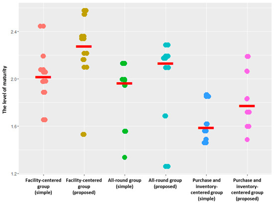 In addition to the sum of weighted score, the median and distribution of simple and proposed score for each group are summarized in Figure 5. As shown in the figure, the median and sparsity of each group has increased significantly by applying the proposed methodology. Also, the median and sparsity of each group is diverse according to the parts of value chain that are companies focus on. In particular, the gap between the highest and lowest score for each group increased significantly. These results show that the proposed methodology provides a better understanding of the maturity level of smart factory because of the improved power of discrimination.