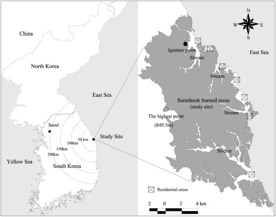 - Korea Forest Service. Fires in Eastern Regions; Korea Forest Service: Daejoen, Korea, 2001; Volume 1, pp. 33–36. [Google Scholar]