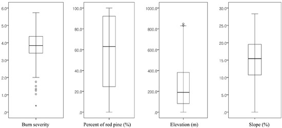 3.2. Relationships of Burn Severity with Japanese Red Pine and Topographic Variables