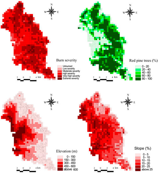 3.1. Spatial Distribution of Burn Severity and Percentage of Japanese Red Pine