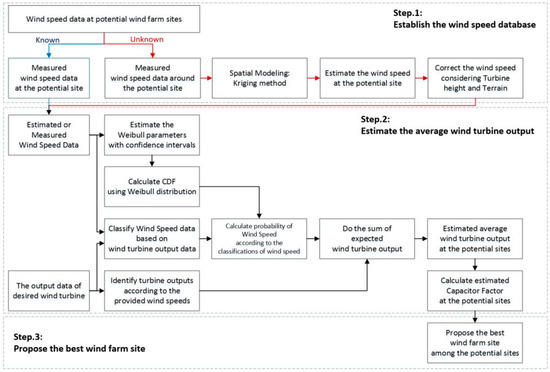 We propose the stochastic method to select the best wind farm among the potential wind farm sites using the spatial method and Weibull distribution. When planning to build a wind farm, we consider the wind speed resources at potential sites. In most cases, however, it is difficult to obtain wind speed data for the sites. In this paper, we consider the case where we do not know the wind speed data of the area of interest. We apply spatial interpolation called the Kriging method to obtain wind speed data for specific sites, thereby reducing the estimation cost of selecting the proper wind farm. The flowchart for proposed method is shown in Figure 1.