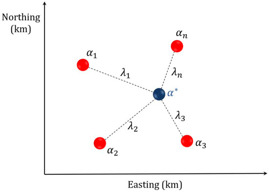 The Kriging is one of the spatial interpolation methods based on regression against observed values of neighbor data points, weighted according to spatial covariance values. The general formula for the Ordinary Kriging method is shown in Equation (1) [17,18].