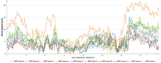 In this case study, we select Jeju Island, which has many potential sites for wind power generation. To apply the Kriging method, we use location information and wind speed data measured in the 10 meteorological (MET) towers in Jeju Island of South Korea. We consider the optimal wind farm among four potential wind farm sites. Figure 3 shows four potential wind farm sites and 10 neighbor meteorological towers in Jeju Island using Google Maps. Before applying the Kriging method, we collect latitude, longitude, and elevation data for 10 meteorological towers and four potential wind farm sites. This coordinate data used in this paper is shown in Table 2. The wind speed was measured at the meteorological towers on 5–15 February 2016 in one-hour intervals, and its time series plot is shown in Figure 4.