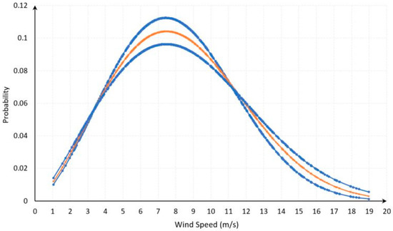 The probability density function of estimated wind speed can be calculated based on the estimated Weibull distribution parameters. Figure 7 shows the probability density function of estimated wind speed for Potential Wind Farm C, where upper and lower bound represent values of the confidence level 0.975.