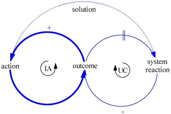 System archetypes were first named as such by Peter Senge in his 1990 book The Fifth Discipline: The Art and Practice of the Learning Organization [43]. However, already by the 1960s the pioneers of systems thinking had observed several reoccurring systemic structures and associated behaviors, and in the 1980s Michael Goodman, Charles Kiefer, Jenny Kemeny, and Peter Senge began to catalogue them. Today a catalogue of ten system archetypes is widely acknowledged by systems thinking practitioners [40]. These are Limits to Growth, Shifting the Burden, Eroding Goals, Escalation, Success to the Successful, Tragedy of the Commons, Fixes that Fail, Growth and Underinvestment, Accidental Adversaries, and Attractiveness Principle. Each system archetype consists of four generic elements. The first element is a specific pattern of behavior over time that can be graphed or expressed in a narrative (if data is not available). The second element is a distinctive systemic structure presented in the form of a causal loop diagram. A generic systemic structure of an archetype involves two feedback loops: (1) reinforcing or balancing intended action (IA); and (2) reinforcing or balancing unintended consequence (UC) as well as a delay mark (‖) symbolizing that the action and reaction occur in different time periods (Figure 1) [41]. The third element is an associated storyline that explains the behavior–structure interplay (i.e., causal theory). Finally, there are also well-defined yet generic solutions that proved to be effective in resolving the undesirable archetypical behavior (Figure 1). Braun [40] as well as Kim and Anderson [39] provide a detailed description of all ten system archetypes.