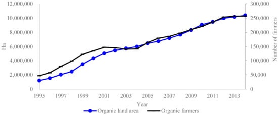 Evolution of the number of organic farmers and land area in the EU-28, 1995–2015. Source: FiBL survey based on national data sources and Eurostat, 2017 [12,13].