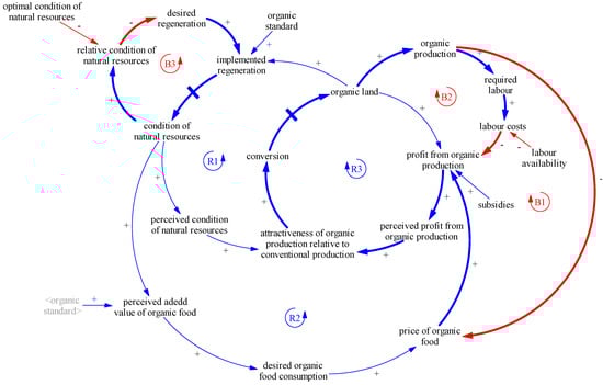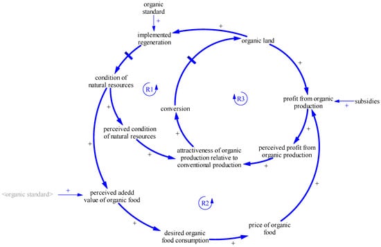The state of affairs had changed by around the 1980s–1990s. In response to increasing environmental concerns and demand for organic products, policymakers introduced a range of specific legislative, financial and communication measures [51]. First, organic standards, i.e., the EU Council Regulation 2092/91 (current version: Council Regulation 834/2007) and associated legislation, were implemented in order to protect market participants from free riders labeling their conventional products “organic” or “bio” to capitalize on price premiums. Through this legislative framework policymakers strengthened the two reinforcing feedback loops R1 and R2 (Figure 4).