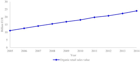 Evolution of organic retail sales in the EU-28, 2005–2014. Source: FiBL-AMI surveys, 2006–2016 and OrganicDataNetwork surveys, 2013–2015 [12,13].
