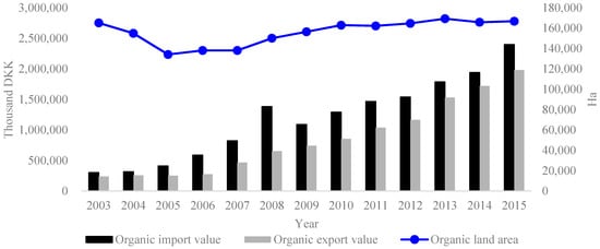 Evolution of organic land area, import value and export value in Denmark, 2003–2015. Source: StatBank Denmark, 2017 [66].