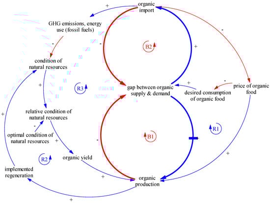 The first unintended reinforcing feedback loop (R1; Figure 9) arises from the market-based mechanisms on which organic farming relies. As the organic food market is increasingly supplied by imports, the price of organic food, especially at the farm gate, falls [57]. In turn, a lower price, ceteris paribus, implies lower profits, and hence reduced incentive for European farmers to produce in an organic manner. Consequently, the gap between domestic organic food production and desired organic consumption widens further, increasing again the need for imports. The reinforcing feedback loop R1 (Figure 9) is a vicious circle that leads to a lack of long-term viability for organic farms and thus limits the potential of organic farming to be an engine of rural development [57].