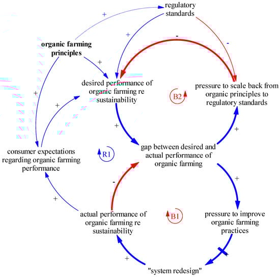 Eroding Goals: implementing corrective actions (B1) versus lowering goals (B2) to reduce the gap between desired and actual performance of organic farming along with unintended reinforcing processes related to erosion of consumer expectations (R1).
