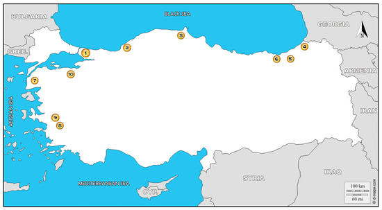 Turkey and sites investigated by the research team. 1: Şile, 2: Zonguldak, 3: Sinop, 4: Artvin, 5: Rize, 6: Trabzon, 7: Çanakkale, 8: Aydın, 9: İzmir, 10: Bursa. Image source: d-maps.com.