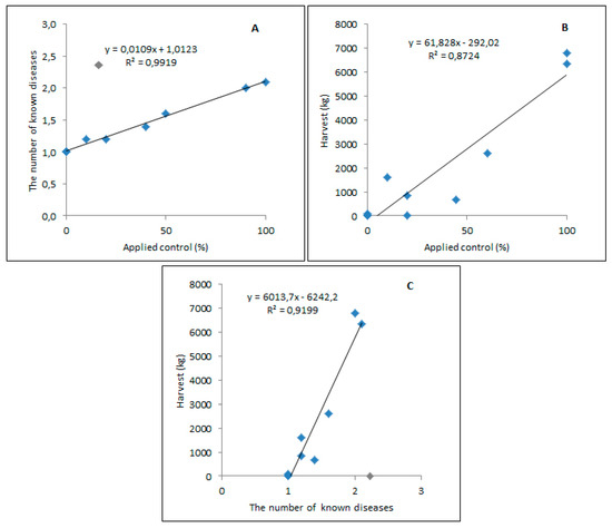 The results of regression analysis. (A) The relationship between the mean site percentage of the presence of reported acts of disease management and the number of known diseases. The gray rectangle represents the data from Şile, removed from the analysis. (B) The relationship between mean harvest quantity per household and mean site percentage of the presence of reported acts of applied control. (C) The relationship between mean harvest quantity per household and the number of known diseases. The gray rectangle represents the data from Şile, which is removed from the analysis.