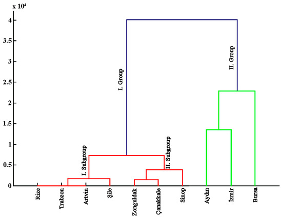 Cluster analysis included site mean harvest quantity, percentage of households per site that applied control, the number of known diseases and income, and classified sites into two main groups (Figure 3). Most of the sites fall into the first group which includes two subgroups. The first subgroup consists of the sites in the eastern Black Sea region (Artvin, Trabzon and Rize) and Şile, while the second subgroup includes Zonguldak, Çanakkale and Sinop. The second main group includes the households from Aydın, İzmir and Bursa.