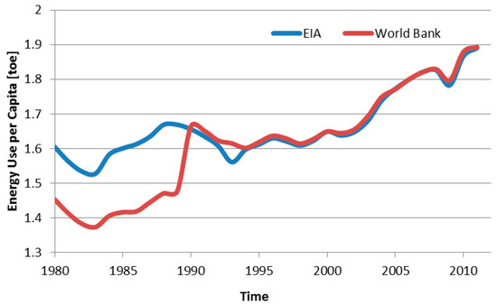In 2012, fossil fuels and in particular oil, played a key role in the primary energy demand [20,21]. More in detail, the energy use per capita reached a peak in 2012, the second maximum value after 2008, when it was 9% higher than the peak in 1990. At the beginning of the financial crisis, the value decreased from 1.83 to 1.80 tonnes of oil equivalent (toe) per capita. Then, it increased again to 1.92 toe in 2012 [22]. Figure 3 shows data regarding the energy use per capita during the last thirty years from the International Energy Agency [20] and the World Bank [22]. Both these sources show uniform values regarding the Energy use per capita after 1990.