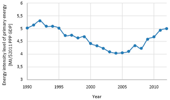 Energy intensity was used as an indicator to evaluate the energy efficiency in past years, although differences exist between energy intensity and the measure of energy efficiency [23,24]. In fact, the energy use per dollar of GDP depends on several factors, among them there is the conversion of energy. A reduction in energy intensity might represent an improvement in energy efficiency, e.g., thanks to new technologies, but also an increase in energy prices. The non-OECD economies have still high energy intensities. Khatib affirmed that the decrease of energy intensity in the Organization for Economic Co-operation and Development (OECD) members has been caused by the heavy industry movement from the OECD to non-OECD countries [25].