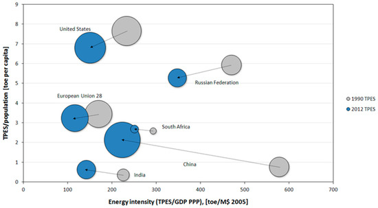 The years between 1990 and 2012 were characterized by an energy intensity decrease for China, Russia and India; this appears clear making a comparison with United States and European Union (Figure 5). United States, European Union and Japan, countries characterized by a higher GDP per capita, show an energy consumption decrease. On the other hand, developing countries characterized by an increase of GDP, such as China and India, showed an energy consumption increase [20].