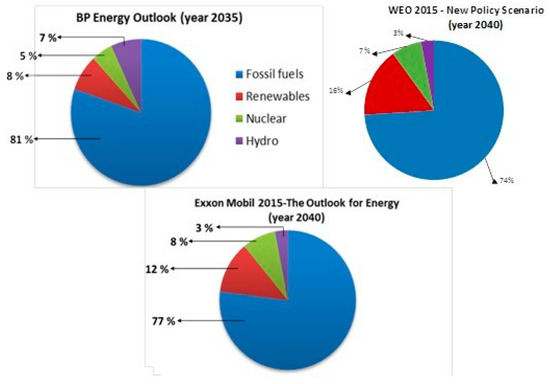 Comparison of future energy mix among different scenarios. Source: BP, 2015 [19]; IEA, 2015 [2]; Exxon Mobil, 2014 [28].