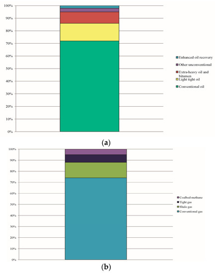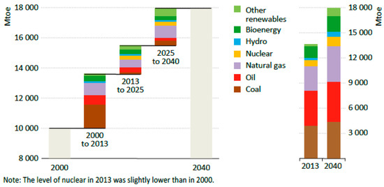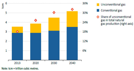 The so-called “golden age of gas” declared by the IEA analysts will continue, because natural gas is an attractive resource, cheaper than oil and largely available. There were reserves of about 28,500 trillion cubic feet (tcf), corresponding to 807 thousand billion cubic meters (bcm), at the end of 2014 [3,29]. Nevertheless, the share of fossil fuels will gradually drop over the next twenty years; in 2014 it amounted to 81% of the total demand. This variation is due to the measures and the policies that address to cleaner fuels and the development of new technologies.