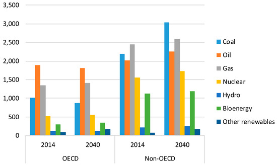Global coal consumption grew by 0.4% in 2014 [19]. So far, the growth in coal consumption has been lower than expected, generating excess capacity and falling prices. In the OCSE area, coal demand is expected to decrease by 40% by 2040, while Asia will account for four-fifths of the world’s demand due to the electricity system in many Asian countries.